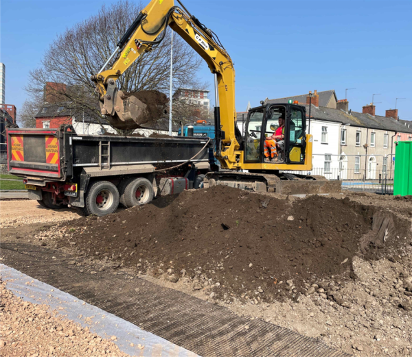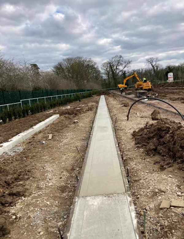 Civils works range from kerbing, attenuation systems, drainage, reinforced geogrid installs through to insitu concrete pours for floodlight columns.